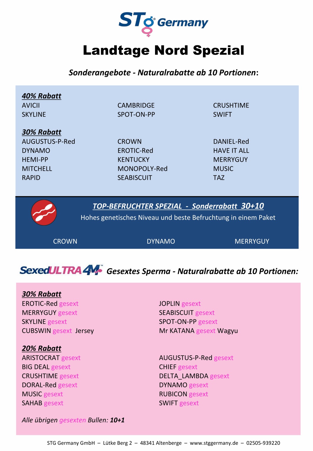 Kommen Sie zur "Land Tage Nord" nach Wüsting. Die Messe findet vom 20. - 23. August statt. Unsere Mitarbeiter erwarten Sie am STG-Stand mit der Nummer D4 und halten neue Informationen der August-Zuchtwertschätzung für Sie bereit, und außerdem können Sie von unseren Messeangeboten profitieren.