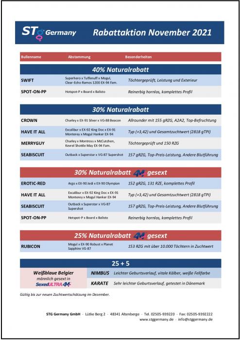 Nur für kurze Zeit bitte wir unseren Kunden Rabattte auf ausgewählten Bullen an. Wir bitten Angebote für konventionelles und gesextes 4M Sperma. Sichern Sie sich noch bis zum 06. Dezember Sonderkonditionen für folgende Bullen: