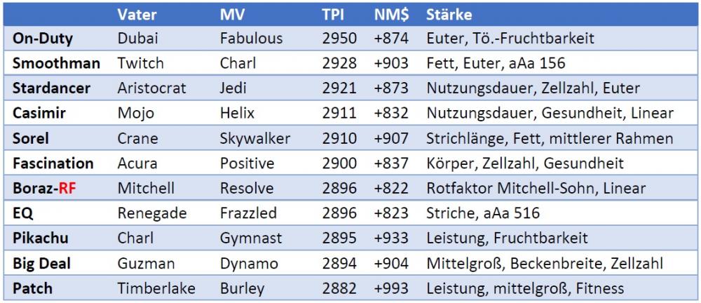 Die neuen frühen geprüften Bullen sind die bekannten TWITCH, ARISTOCRAT und JONES. Alle drei sind bereits aus der genomischen Zeit bekannt und halten sicher stabil mit den ersten Töchtern. Twitch liegt sogar bei 2843 TPI, die anderen beiden um die 2700 TPI.