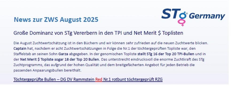 Nach der August-Zuchtwertschätzung haben wir für Sie ein neues vorläufiges Bullenangebot zusammengestellt. Die neuen Preise folgen am Montag.